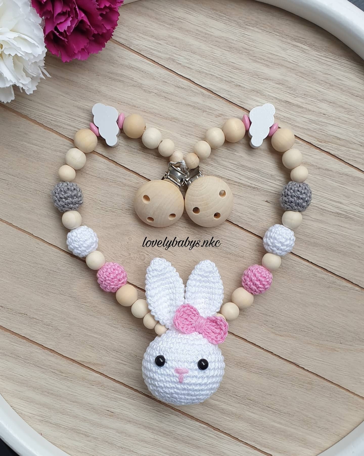Entdecke unsere liebevoll handgefertigte Kinderwagenkette mit unserer Häkelhase und mehreren Häkelperlen.